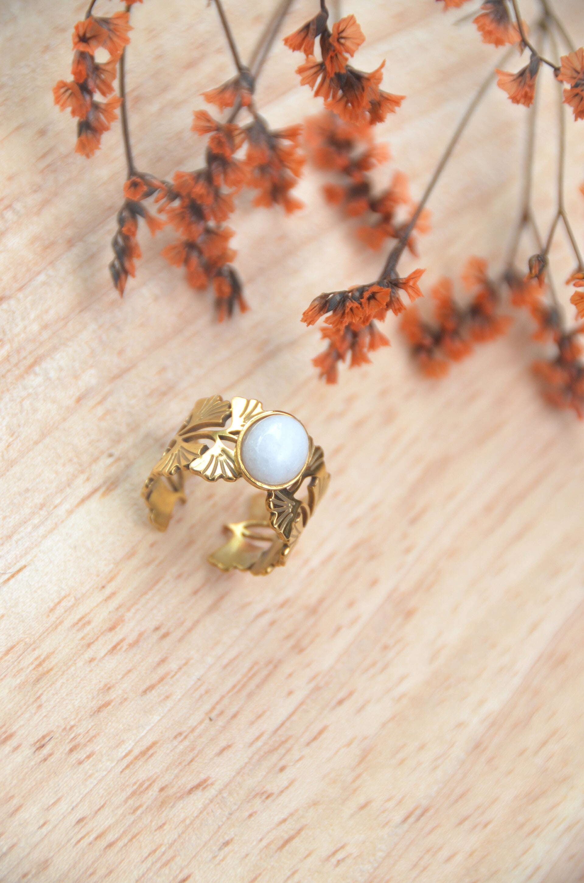La pierre centrale évoque la douceur lunaire, apportant calme et clarté à celle qui la porte.