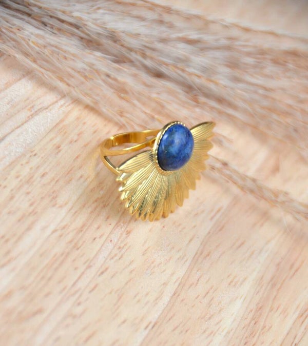 Son design rayonnant évoque un soleil stylisé, éclos autour d’une pierre bleue profonde, comme un ciel nocturne ou un océan de sagesse. L’or fin, finement ciselé en faisceaux lumineux, accentue la majesté de cette pièce à la fois audacieuse et intemporelle.